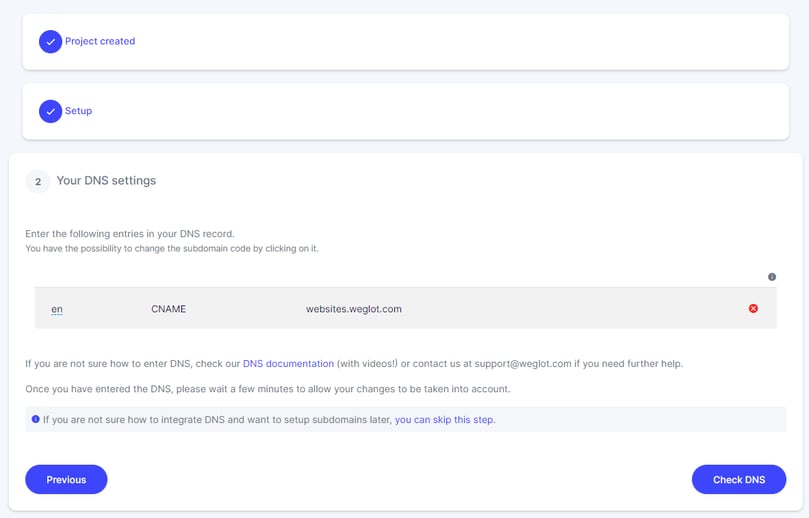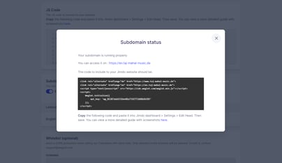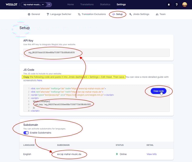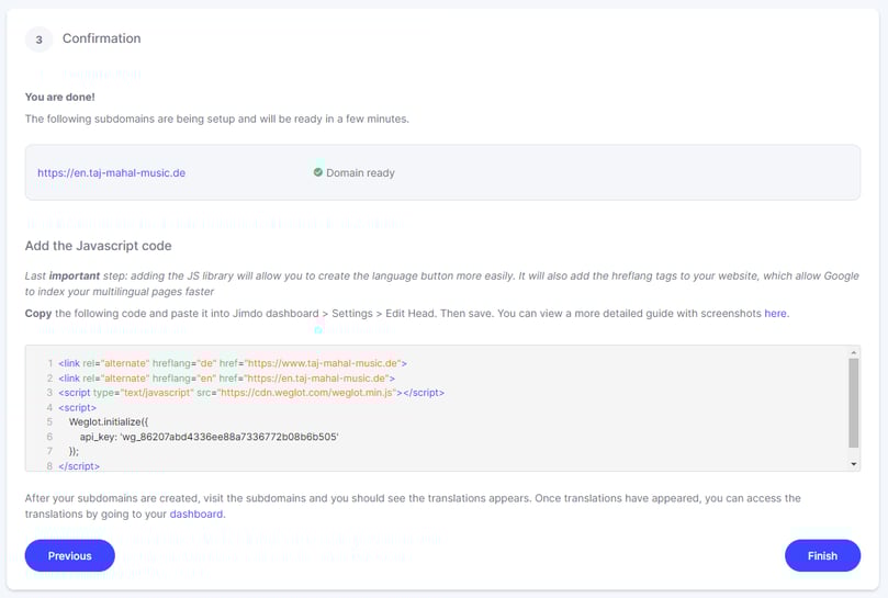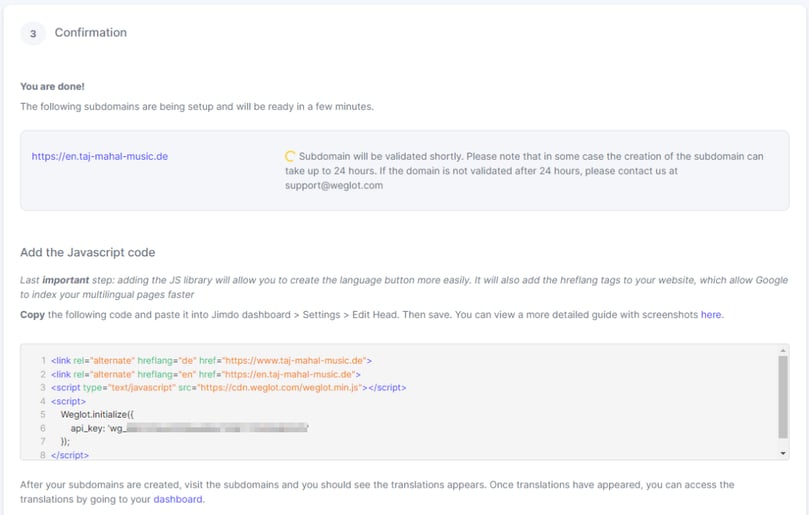 To complete the configuration of the Weglot widget, the only last step is to use the Weglot widget on the Jimdo site. To do this, Weglot provides a script that can be which can be called up on the setup page in the Weglot dashboard: