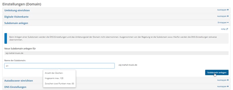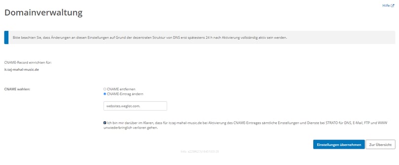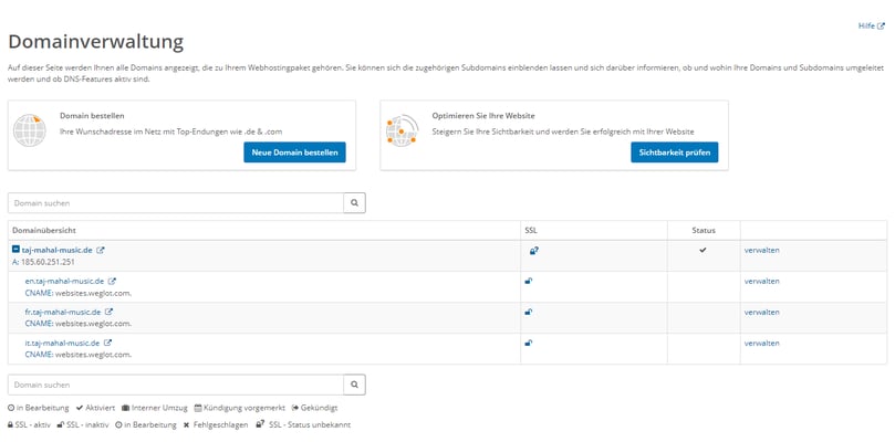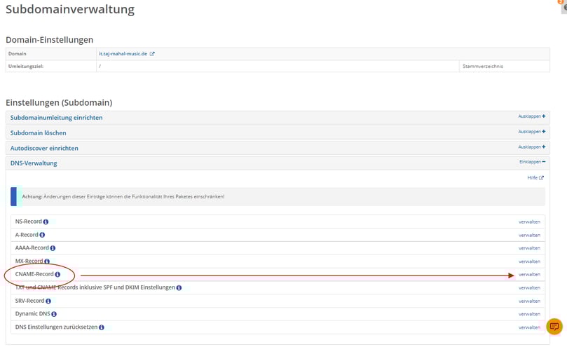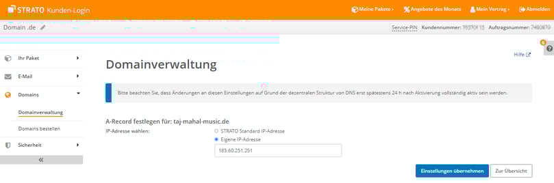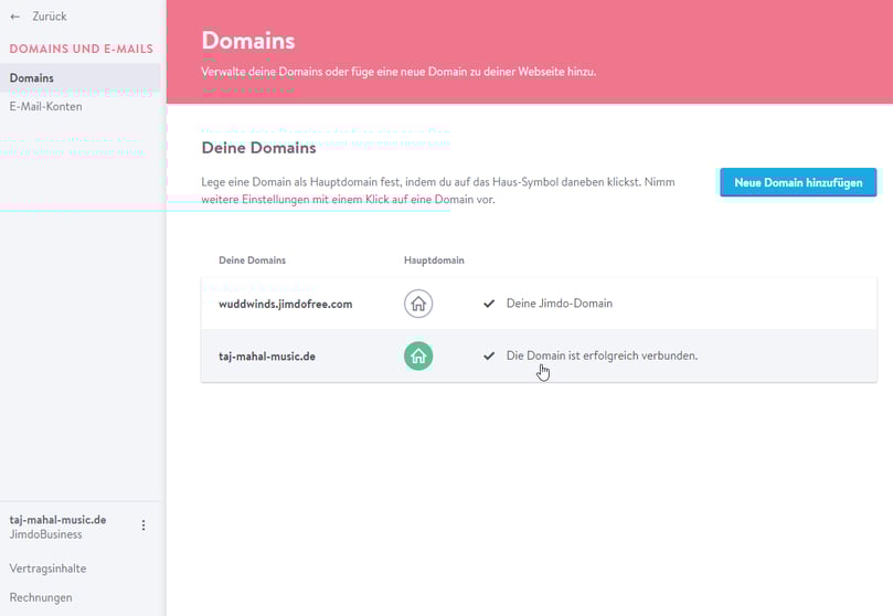 Important: For this integration method you need a domain hosted on an external server! If you have your domain managed directly by Jimdo, you will not be able to make any DNS (Domain Name Service) settings. (Domain Name Service) settings. If you have set it up this way, you should move the domain to an external provider that allows its own DNS management and then re-install your website. and then reconnect your website to the domain.
